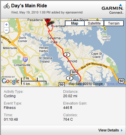The second ride was a 20 mile mid-day ride to get some miles in. It was here I noticed the lingering effects of the blood donation last Saturday. The route was the trail to the top of the Naval Academy bridge and return. It was quite an effort. I stopped once to photograph a turtle that was making its way across the trail. (Actually, I needed the breather.) [After uploading the Garmin info, I was surprised to note that I averaged 17 mph.]
