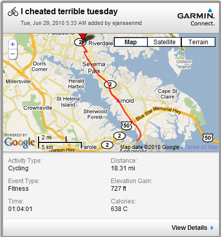 It was a humid morning. It rained overnight. I set a good pace for myself and kept the heart rate up but in a reasonable range. By the end of the trail I was feeling pretty good and continued south to the peak of the Naval Academy Bridge. The sun was a few degrees above the horizon, there was a breeze blowing a chop on the Severn, and it was simply a gorgeous morning with a great view.