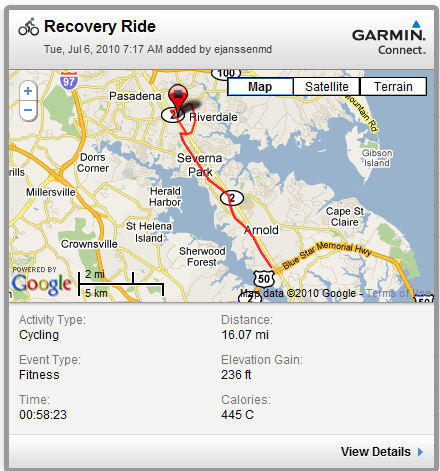 The B&A Trail is not only the spandex highway in these parts, but it is also a social place.  A cruiser bike rider had stopped to talk to two of her girlfriends who had been walking.  Their social group required the entire width of the trail.  I called out early.  No response.  I called out again.  Nothing.  Then just as I began to call out, “Stay where you are” (so I could negotiate around them), they moved, scattering directly into my path on the grassy side of the trail.  Luckily I had chosen the biker side, she was slower having to also move the bike, and I had slowed enough that I missed them.  Does it really take much to move to the side of the path for even a short conversation?  Although I had been slowing, my heart rate spiked to around 135 and it took longer than usual for it to come back down.