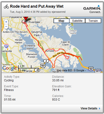 Jeff texted me today to see if I was up for a ride this evening. Lori was working, so I figured, why not? I also had been considering the 5:30 Severna Park Peloton ride but decided to meet Jeff at 4:45 and head out for an easy ride. At least that is what I was promised. The stats don’t show how hard this was. We maintained an average of 17.1 mph over 33 miles, and at the end of 20 miles or so, we had an average of 17.6 mph. It was at mile 21 where it got really hard for me. I was drenched in sweat, even wringing out my headband. I had no power up the hills. I had been drinking water and taking e-caps, and even downed two breakfast bars attempting to stay ahead of the nutrition/hydration curve. Jeff continued to press on, attacking the hills and urging me on. I did what I could, but I know I left him wanting more.