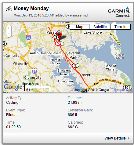 I had the fenders on, and was out the door early enough that I put in a few extra miles before meeting up at the Rusty Bridge. By the time we picked up all the riders, we had 10 this morning. I was on the front for the first half, setting a pace that wasn’t really Mosey Monday … sorry guys (but you wouldn’t know it by the average speed, only 15.6). We took the route into Round Bay for the hill and rode the milled part of Old County Road. It is a lot easier riding up on the milled part than riding down it! At the turn around, I dropped back into the group and rode easy with the rest. I do like how the miles just pass by when in a group and headed down B&A Blvd.