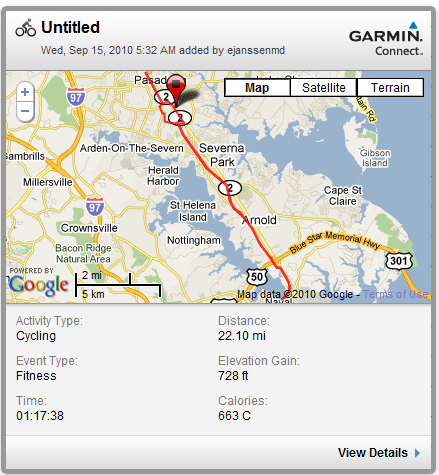 It was cool, about 58 degrees when I went out. I was out in my new arm warmers and leg warmers purchased yesterday at the Performance Bike shop in Columbia, MD. I’m not sure I needed the leg warmers, but the arm warmers helped. Nothing else in my kit was different. I could have used a little more for my core. My new socks, shoe covers, and gloves are due Monday.