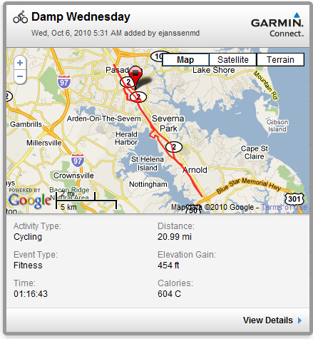 With the Seagull Century coming on Saturday, my goal over the next few days is to simply ride easy (with Thursday off). I awoke early this morning, and when checking email, learned that a rain shower was moving through. It looked like it would be gone by the start time, so I put on the fenders, the multiple layers of clothing (52 degrees) and headed out. It had clearly just finished raining, and everything was damp. I was quickly chilled, but it wasn’t long before I warmed up with the ride, and was ready to go.