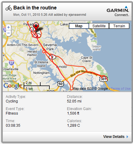 I decided on the loop to Sandy Point via College Parkway and back on the trail. I really didn’t have a lot of strength left in the legs, so I mostly enjoyed the ride. I encountered another SPP rider twice and rode with him for a short distance, and was passed by a Bike Doctor team going faster than I wanted. Besides, I didn’t have the right kit on to match them.