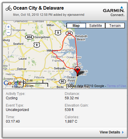 I was ready to be done somewhere around mile 45-50, but had committed to a longer ride. I stopped just a couple miles from the hotel, once I hit the Maryland state line again, just to rest my legs for a few minutes, then pressed on back to the hotel. That shower felt pretty good, and helped to warm me up.
