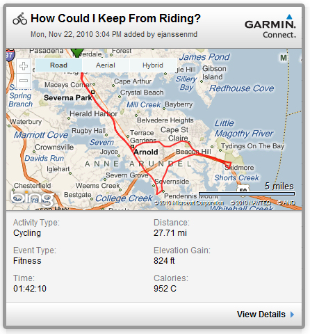 It was a great ride. There was a beautiful sunset. I saw one deer. I was able to turn my head off. I got no flats.