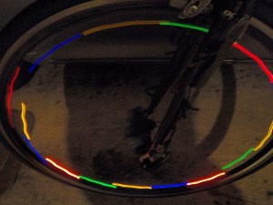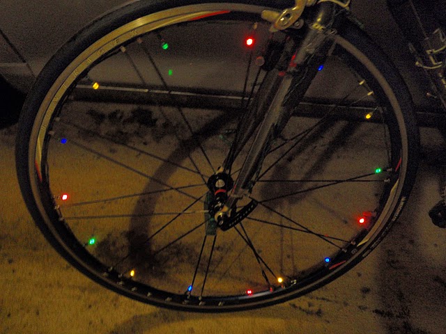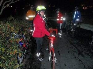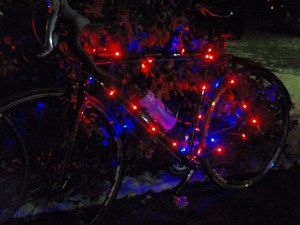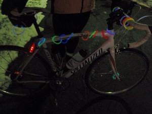 I haven’t told you the next to the best part yet. We decorated bikes. There are battery operated lights, chemical light sticks, glow-in-the-dark necklaces and bracelets that were all used to light up our rides. Clint took some photos and I’ve used some of them here.