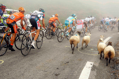 Well, cut the road in half, take out all the other cyclists, eliminate the fog, and turn the sheep into fat goats, and then you have what I encountered. There were 5 goats on the trail, terrified of that red object bearing down on them. I felt like a goat herder as they dashed down the trail, then dove into the brambles on the west side of the trail, back toward their pasture. I don’t know what I would have done had one decided to halt, turn around, and confront me.