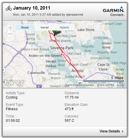 Four of us met at the Rusty Bridge in temps of 20-23° F. Dan had circled the river this morning and was riding with a broken front derailleur cable, meaning he was stuck in the small chain ring. The extra effort of that higher cadence had him sweating so no one lingered in the cold, and we took off. Our pace was brisk. I was definitely riding with three stronger riders, and it showed on the hill in Round Bay and then on the southern stretch of the trail. Once we made it back onto B&A Blvd, I was fine on the rollers. As it turns out, this was my fastest average time for the new year. It wasn’t blazing fast, but in the cold, with extra clothing, I’ll settle for it.