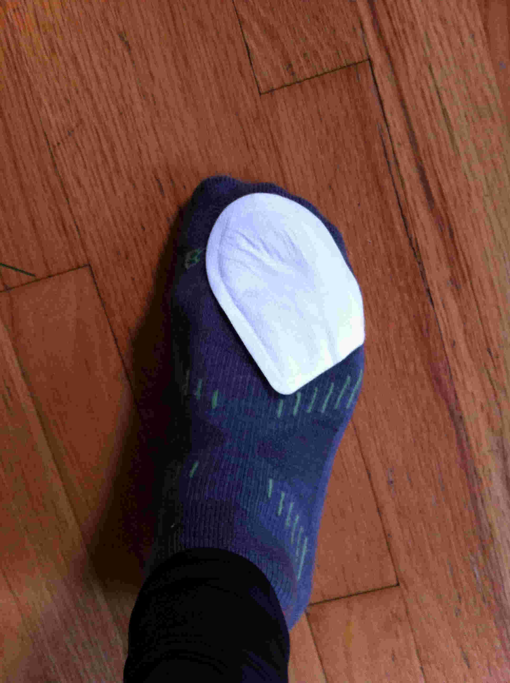 When I purchased these, I hoped they would be sufficient for the entire winter. - Below 40°F, it is time for me to add toe warmers. These are chemical devices designed to work in the low oxygen environment of the shoe, and are specifically shaped for keeping toes warm. (A trick: There is a tendency to orient these with the round part of the warmer toward the toes, but this doesn’t cover very many toes. Orient them more laterally, like this:)