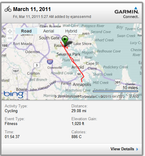 We’ve had rain, up to about 2.5 – 3 inches of the wet stuff over the past 30 hours. The forecast for this morning was no rain (even though there were a few sprinkles at 5:15) and the forecast held. You can tell that the riding itch is starting for those who did not get out much this winter. We had 10-11 riders out this morning (I have a hard time counting that many) for the 5:45 breakfast ride, with 9 riding into Annapolis. It was a pretty morning. We rode at a comfortable pace, had a lot of conversation going, and with that many people we often would talk to someone a few minutes, the positions would change, and soon you were talking with someone else. It was kind of like speed dating on bikes.
