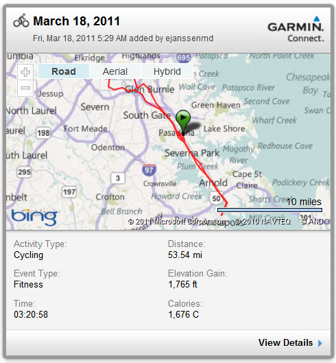 I keep far too many stats on my ride spreadsheet, but note that I’ve got 667.5 miles the past 30 days and for the month of March I’ve already exceeded my miles for March 2010. These stats serve to provide me encouragement and help to keep me focused as my goals revolve around them.