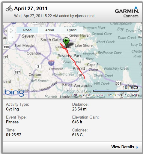 I planned then to rest on Thursday so I am relatively fresh for the Ocean City ride on Saturday. The forecast for Thursday morning was for rain/thunderstorms. Those didn’t materialize, but I’m still glad I took the morning off. I’ll ride the breakfast ride on Friday and then prep the bike for the ride on Saturday. Barring some major catastrophe on the Saturday ride, I’m in fine shape to exceed my April goal of 650 miles.
