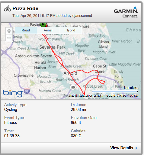 Last fall, Janet B started a Tuesday evening “Pizza Ride” that I was able to participate in a couple of times. Now that the weather has warmed up again, and there is more daylight in the evening, these rides have resumed. Nine of us pushed off from the Rusty Bridge for a good ride into Cape St. Clair, across Hwy 50, into St. Margaret’s and then returning on the B&A Trail to Old Town Severna Park and a local Italian restaurant. It was warm, relatively quick, and a great chance to ride with some I don’t get to ride with very much.
