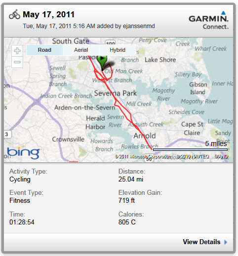 The last hill into Severna Park (on B&A Blvd) is now my “test” section. I stayed seated and kept above 19 mph on this hill. I recall when 16 mph was as much as I could muster up that hill. I’m resolving to use that short, easy hill to full advantage in coming weeks. It serves as a short, nearly invisible interval along the ride.