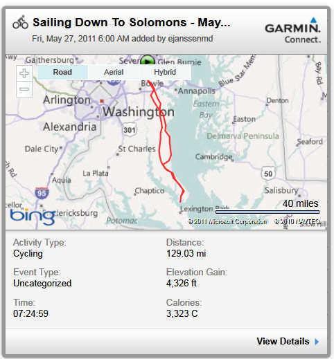 The next 200 k is going to be a challenge to include. There are only 5 days in June where I have the option of riding a 200k because of other commitments, but in reality most have that kind of narrow window because they are timing their 200ks for weekends and around family schedules. If I were restricted to weekends, there is only 1 date possible, and that is the day before I fly cross country, a scenario which could lead to deep vein thrombosis or severe dehydration if not managed properly. I’ll probably try to squeeze another Sailing Down to Solomons in a couple of days before going to California for the start of RAAM.