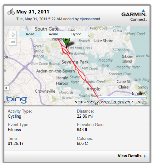 And the miles are in for May. I missed my 800 mile goal by 65 miles, but I had that in the bank. I’ll miss June’s goal of 900 by much more because of RAAM. I’ll have to revisit the monthly goals to see if 8000 miles for the year will be possible.