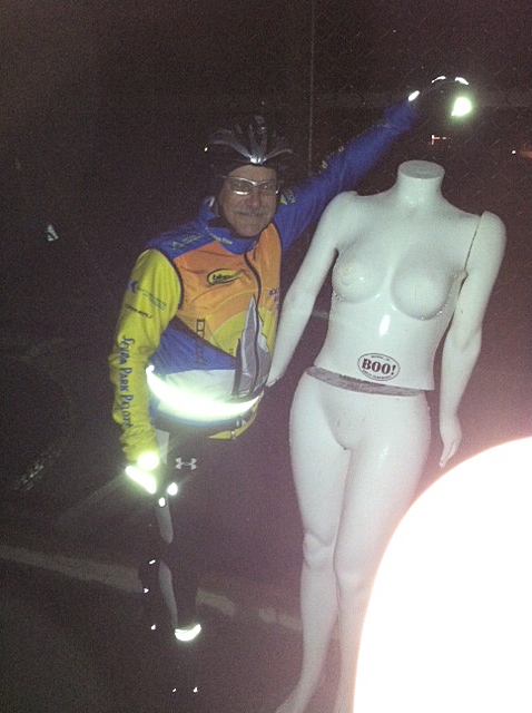 When I got to the Rusty Bridge, I needed to check on some small noises from the bike, but noticed Dennis and what appeared to be a ghost.  There standing on the bridge next to Dennis was a white naked headless female manikin.  You don’t see that every day on the bridge.  Dennis took a photo.   It was then that we noticed the arms were on the wrong side, so we fixed that and made sure everyone else on the ride came up on the bridge to see the sight.