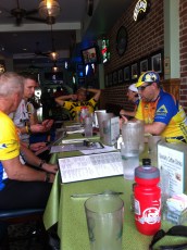 The miles flowed by, and by about 10:15 we had arrived at our breakfast stop at Dave’s Place. Dave’s Place is a “biker bar” (motorcycles, not bicycles) just outside Ridgley, MD. Clint and some others stumbled upon it years ago when they needed some respite from some very cold temperatures. Mary Ann, the owner, has agreed to open the place early for us twice a year. She makes us breakfast sandwiches to order, bakes brownies and cookies for us, runs a raffle give-a-way, has pitchers of water and pots of coffee waiting for us. It is a perfect set up. This year, she announced that the bar had no potable water because of a water main break, but we still had bottled water and nothing was lacking. We descended on the food as if we were a hoard of locusts, eating and drinking everything in sight. You see, by now it had warmed up to the upper 70’s to lower 80’s and we had exhausted our water supplies on the bikes. Some had never ridden that fast before, and were ready for a good break. Mary Ann is good-natured and it is good to see her. She feels like a friend to many. Photos of us hang in the bar, which I’m sure gives the regular patrons a real laugh.
