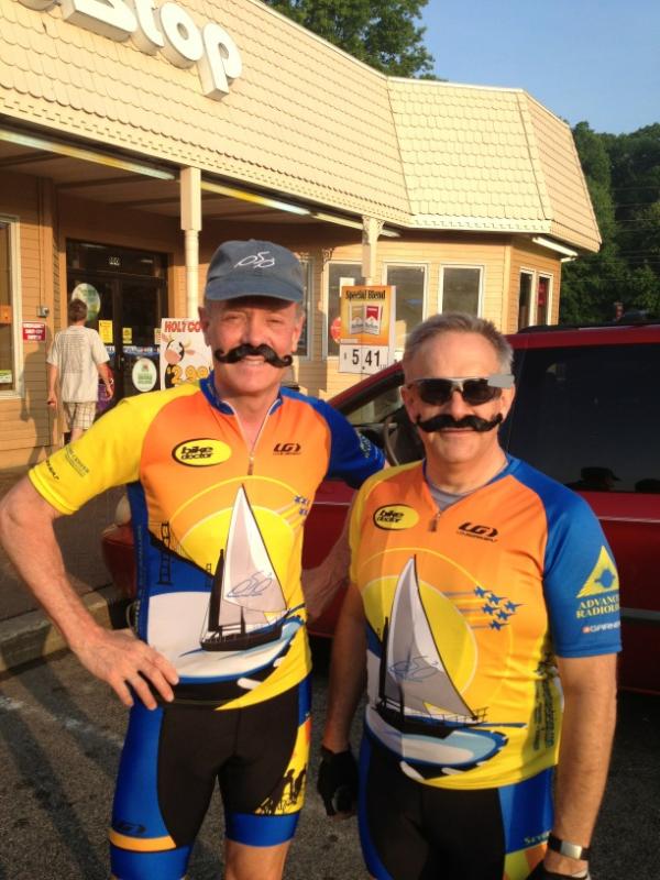 As we prepared to push off for our lunch stop, we took the obligatory photo. Newbies had their hugs (the pole for pole dancing was not up). We slathered on sunscreen in deference to the bright and strong morning sunshine, and worked extra hard to push our bloated bellies out of the way of each pedal stroke. Over the next few hours, we covered miles, found pee spots, had very fast pace lines going and slowed to get a breather. Sebastian had a flat that was fixed in quick order. Somewhere along the way to lunch, we crossed the stalled frontal boundary. The clouds rolled in. The winds picked up. The temperatures dropped. By 1:20 when we arrived in Milton for lunch, it was 63°. Temps had dropped 20 degrees and as we looked at the weather forecast for the rest of the course, I got concerned. I had neglected to consider the forecast for our whole route, and was woefully unprepared. I spent lunch fretting and planning for what lie ahead.