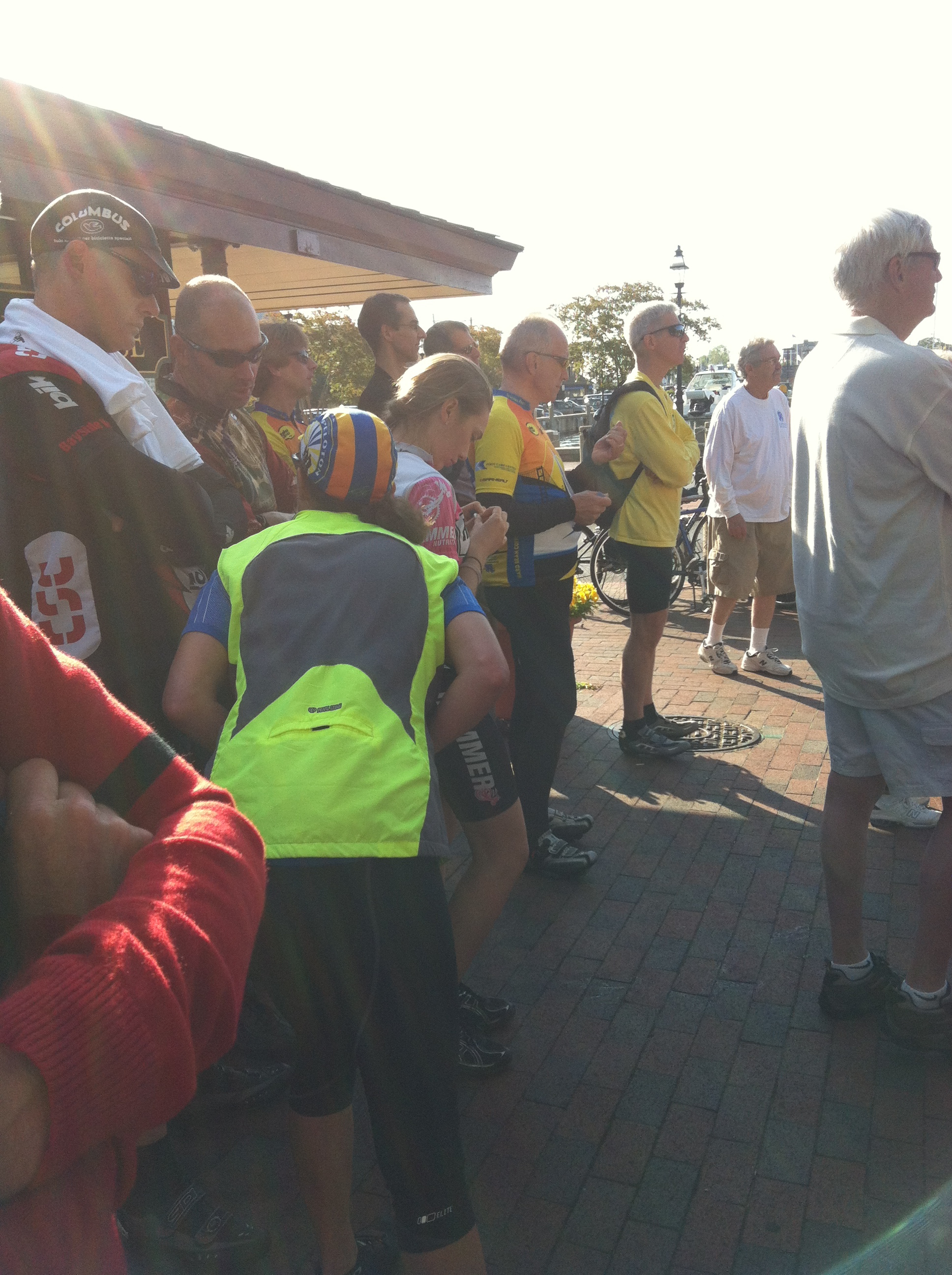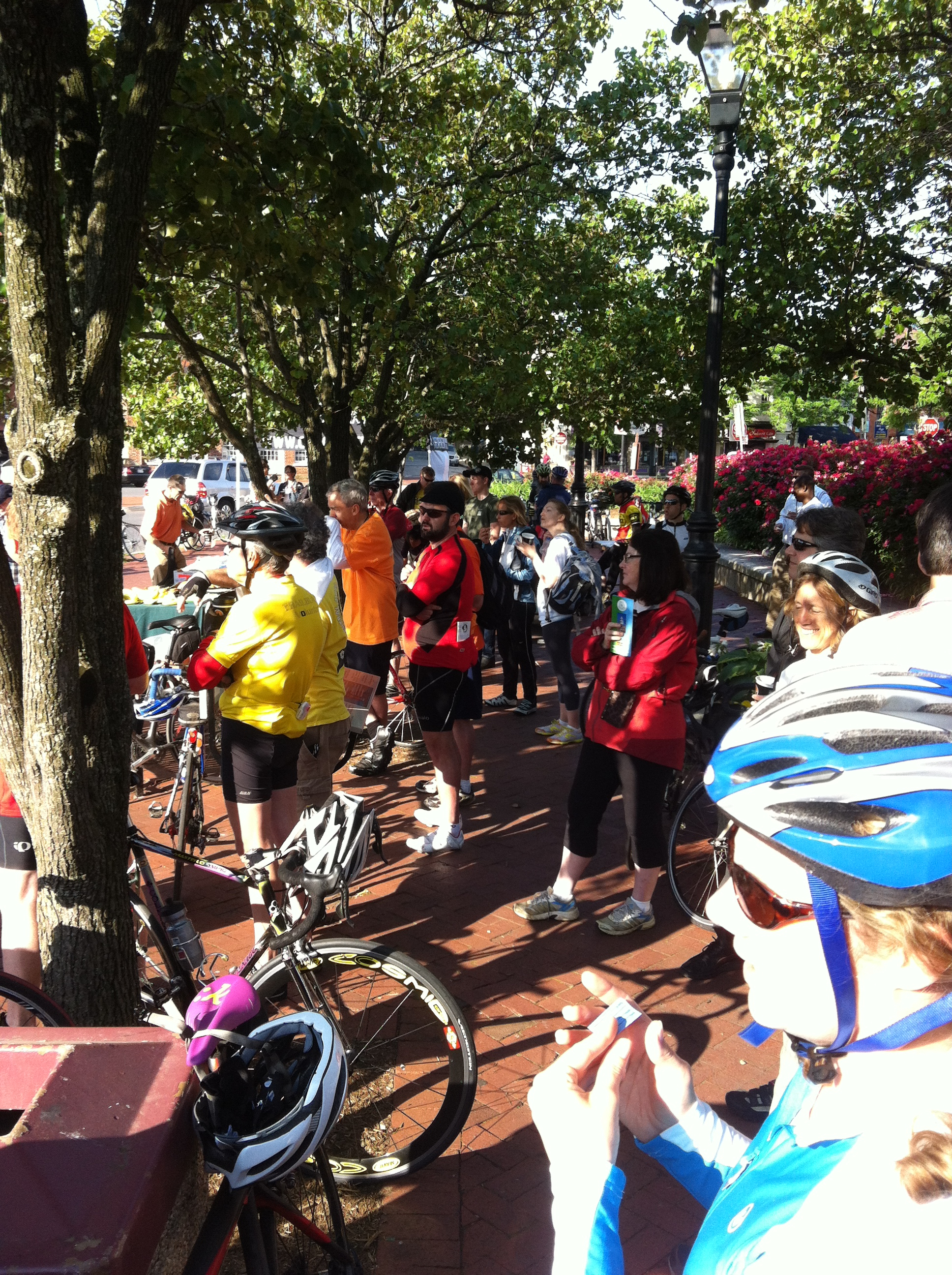The email chain showed how complicated pulling this off would be. We decided to meet at the usual time (5:45 am) at the Rusty Bridge … at least some of us did. Our numbers were quite low for a Friendly Fixie Friday Ride, but we continually picked up riders along the route. The goal was to meet first at Big Bean in Severna Park to take advantage of their free small coffee for bike riders. Big Bean opens at 6:30 am. I planned an easy ride, and as it turned out, rode with someone who needed a slower than usual pace, especially on the hills on Old County Road. I was on the Fixie and didn’t mind this slower pace. We had a good chat, and arrived at Big Bean by about 6:20. By the time we pulled off helmets and gloves and had the cleat covers on, the shop opened and in we went. About 5 minutes later, a whole squad of SPP riders arrived, filling the place and increasing the noise level considerably. I had a macademia & coconut coffee along with a breakfast cookie. By 6:50 we were pushing off to the next stop on TAB2WDPD, the official event at the City Dock in Annapolis.