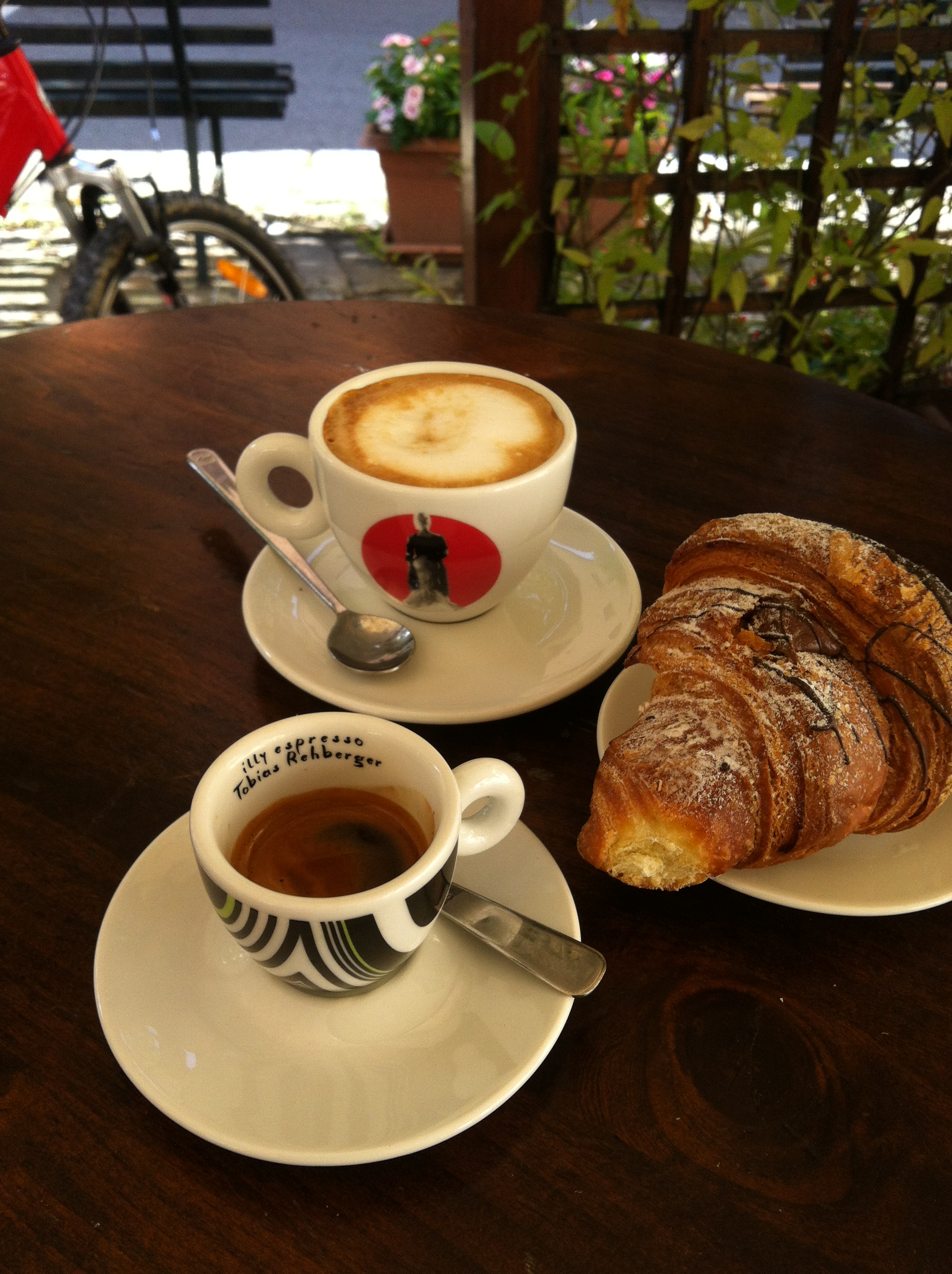 Soon enough those first 2 kilometers of gravel were behind us and we had paved road and all downhill to the town where coffee and pastries were calling our names. We kept the speed down under 35 mph. Not only were these bikes new to us, but both had semi-inflated tires. We had not been able to locate a tire pump before setting off on our journey.