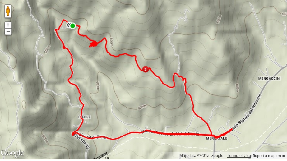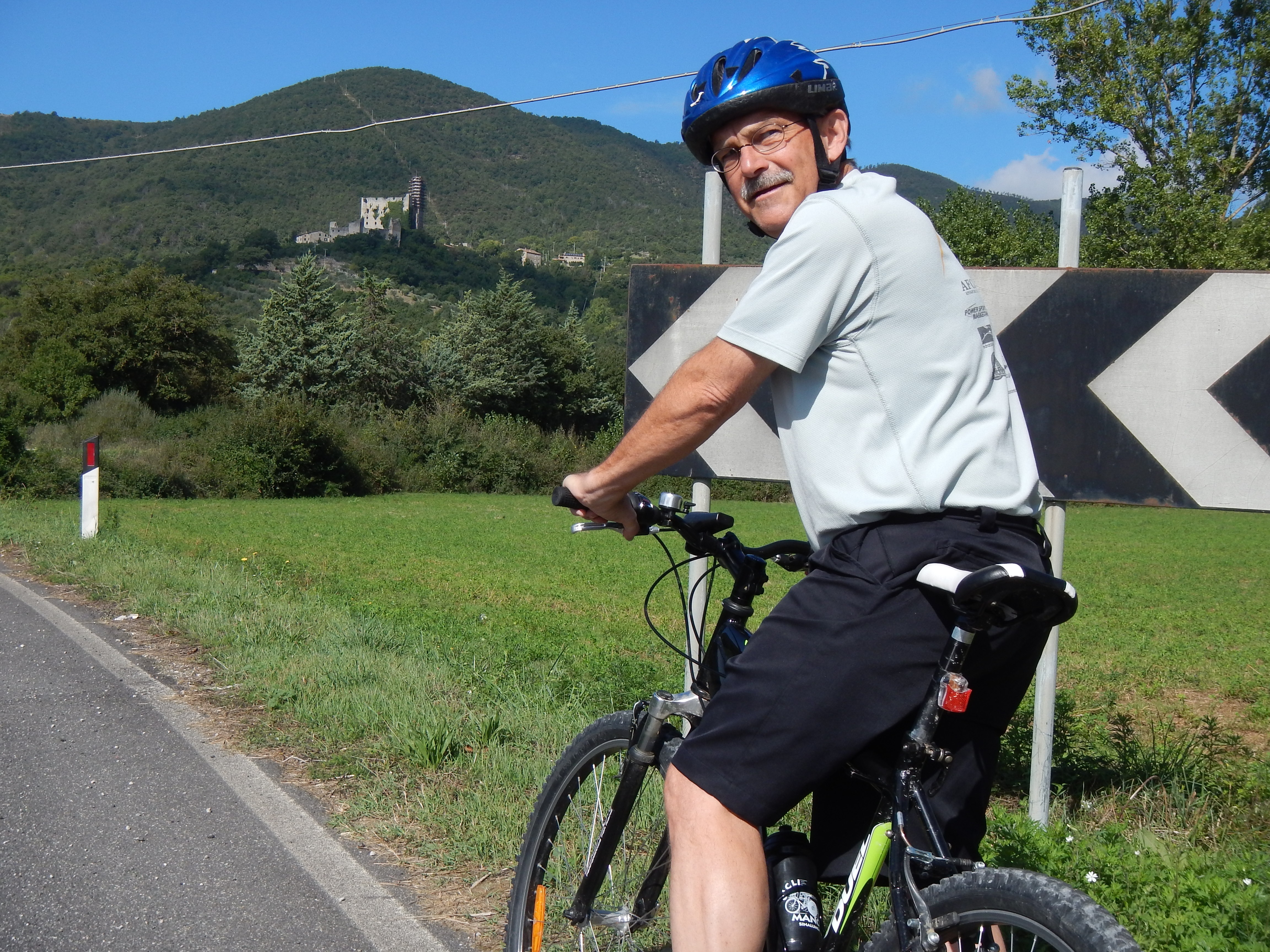 In Mercatale Clint ordered a chocolate filled pastry along with his cappuccino and I simply had an espresso. We ate/sipped outside under clear blue skies. Before returning to our villa, we located a small gas station with an air hose and gauge and topped off each of the tires. They had been under-inflated by 50%. We started back the way we came, stopping for a photo with the hill and the castle in the background. It then occurred to me that taking the trail back might not only be more interesting than the highway, but also since we were more confident on the bike, much more enjoyable. We backtracked into Mercatale, found the terminus of the route, and began to make our way up toward Borgo di Vagli.