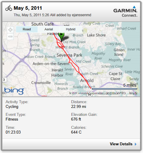 The last hill into Severna Park (on B&A Blvd) is now my “test” section. I stayed seated and kept above 19 mph on this hill. I recall when 16 mph was as much as I could muster up that hill. I’m resolving to use that short, easy hill to full advantage in coming weeks. It serves as a short, nearly invisible interval along the ride.